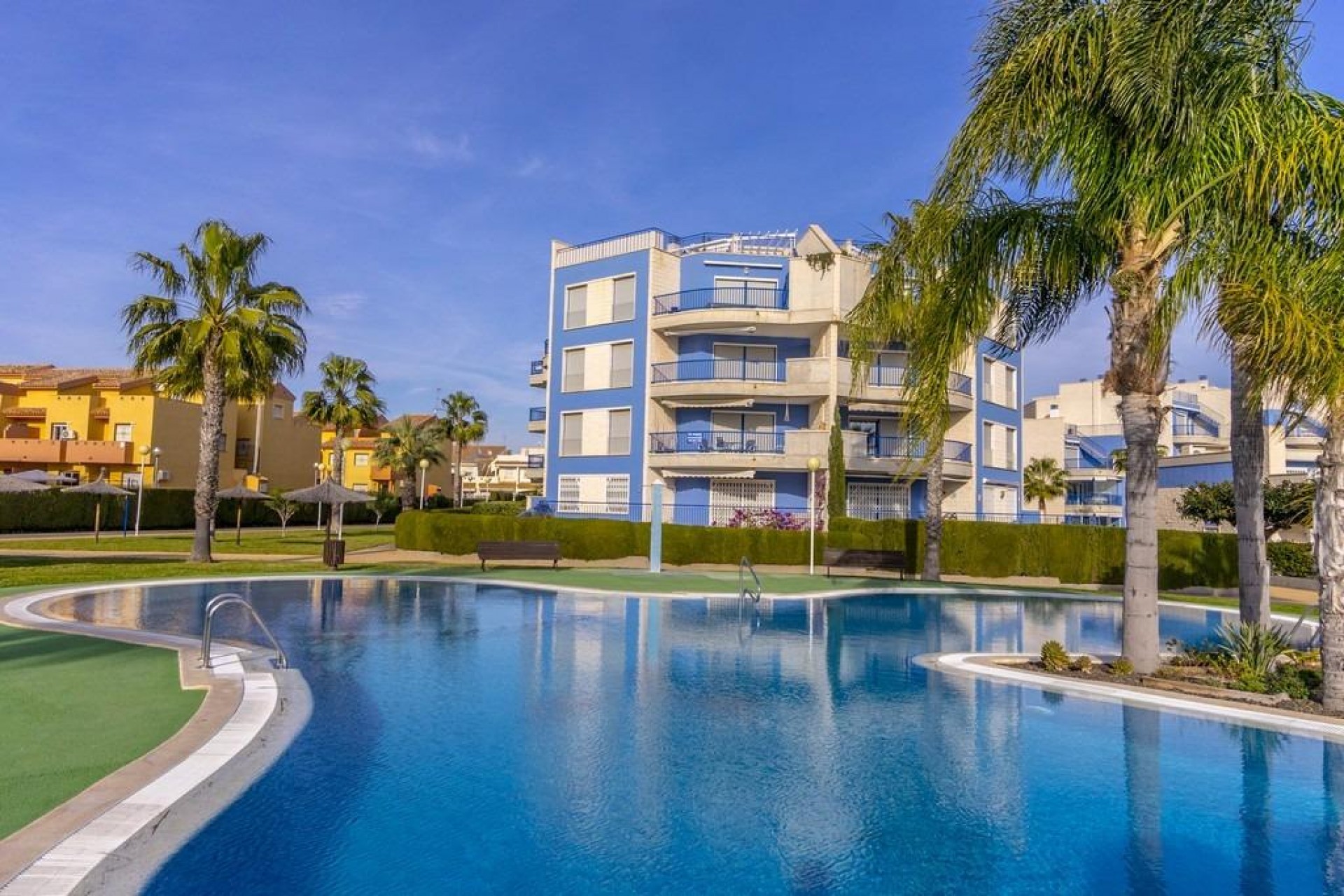 Amplio y luminoso apartamento se encuentra en el exclusivo residencial de Aguamarina, Punta Glea, situado en primera línea de playa, con acceso directo al Paseo Marítimo. Ubicado en la primera planta, tiene una orientación sureste para disfrutar de sol casi todo el día. Con una superficie de 78 m², tiene muy cómoda distribución, para ofrecer confort y funcionalidad.~El apartamento dispone de dos amplios dormitorios, cada uno con armarios empotrados, proporcionando gran capacidad de almacenamiento, y dos baños completos.~La cocina independiente está completamente equipada y con lavadero. Luminoso salón-comedor, una amplia terraza, accesible desde el salón y del dormitorio principal, es el lugar perfecto para disfrutar de las vistas a los jardines del complejo y al mar. El apartamento se vende parcialmente amueblado, aire acondicionado frio/calor por conducto. Apartamento cuenta con una plaza de aparcamiento en el garaje subterráneo.~El complejo residencial cuenta con una espectacular piscina, rodeada de jardines, ideal para disfrutar de los días soleados y relajarse a pocos pasos del mar. Una ubicación inmejorable, con la comodidad de estar en primera línea de playa y con todas los servicios a pie.~